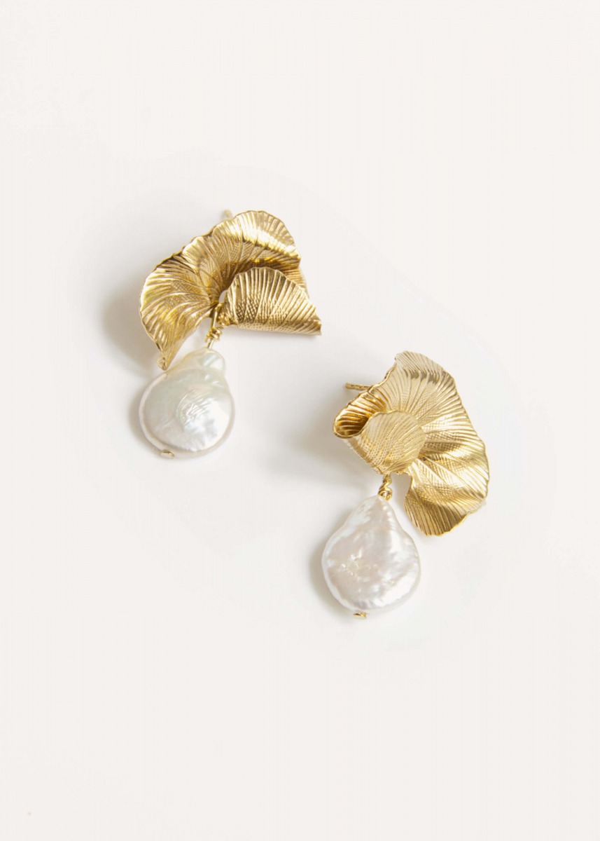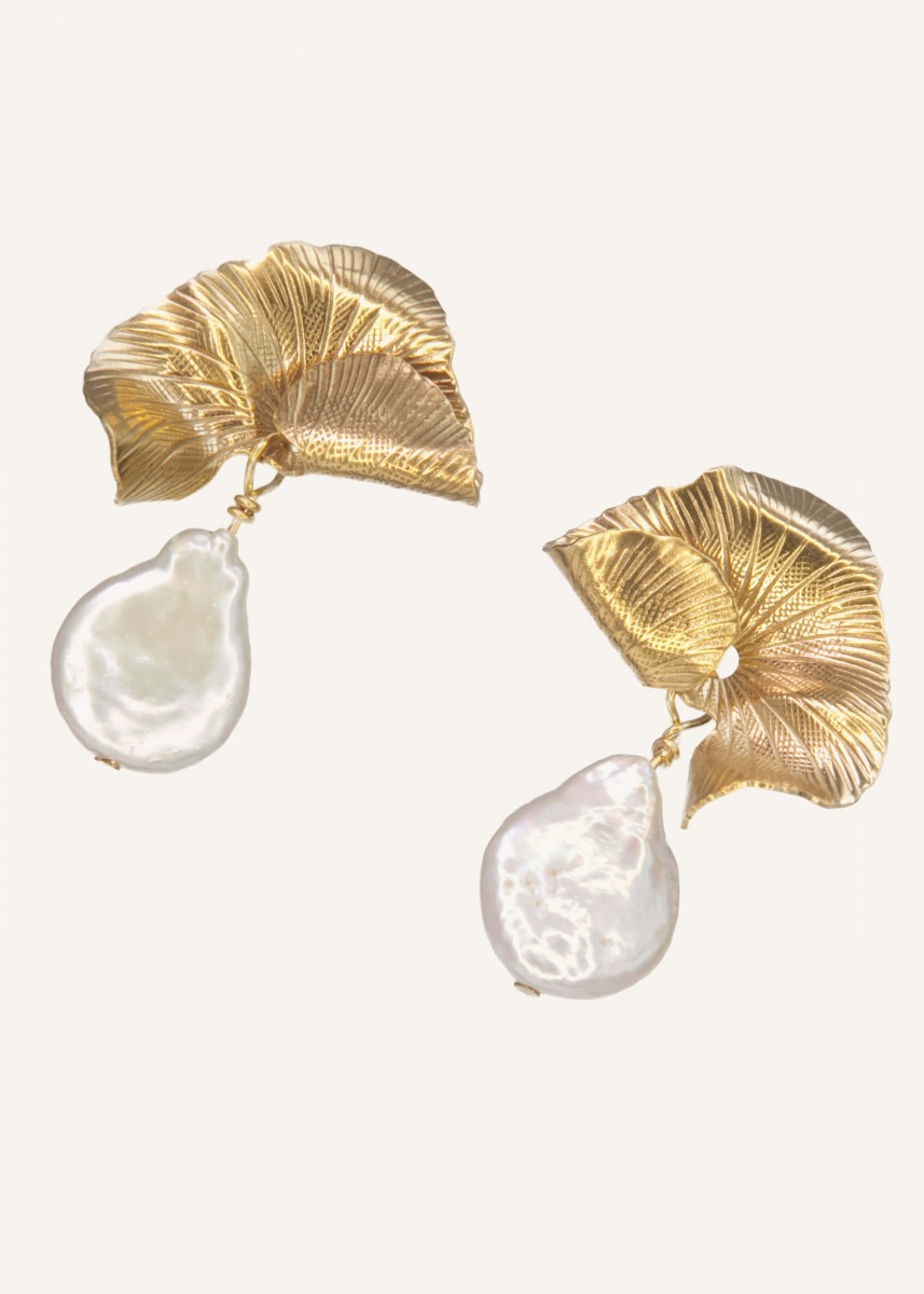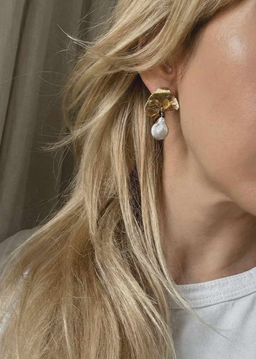 The Darcy earrings are a tribute to nature's imperfect beauty, encased in a sculptural, gilded form. Large, unique baroque pearls meet organically textured metal, creating a striking contrast between raw aesthetics and refined elegance. These statement pieces are designed for the modern woman, effortlessly transitioning from a casual day look to high-fashion evening attire.