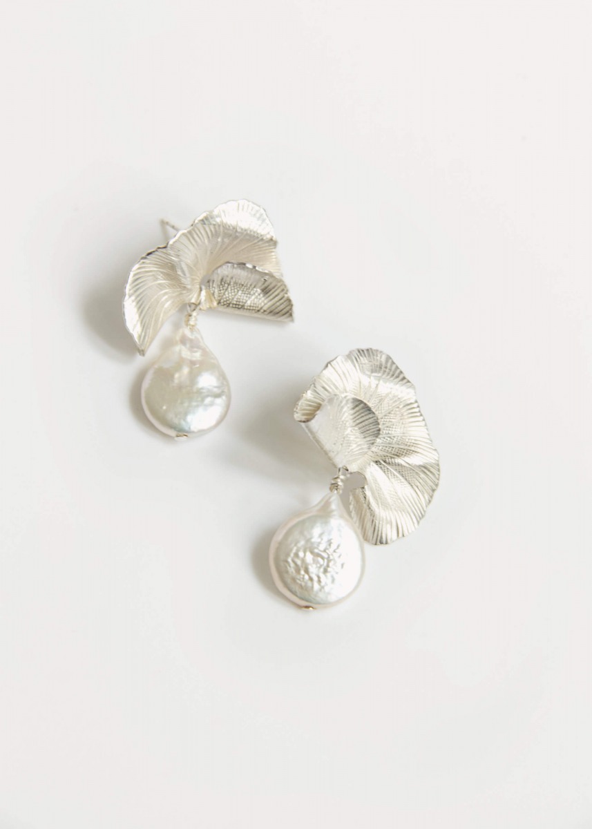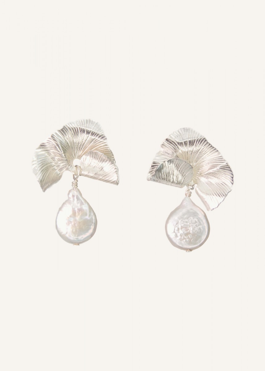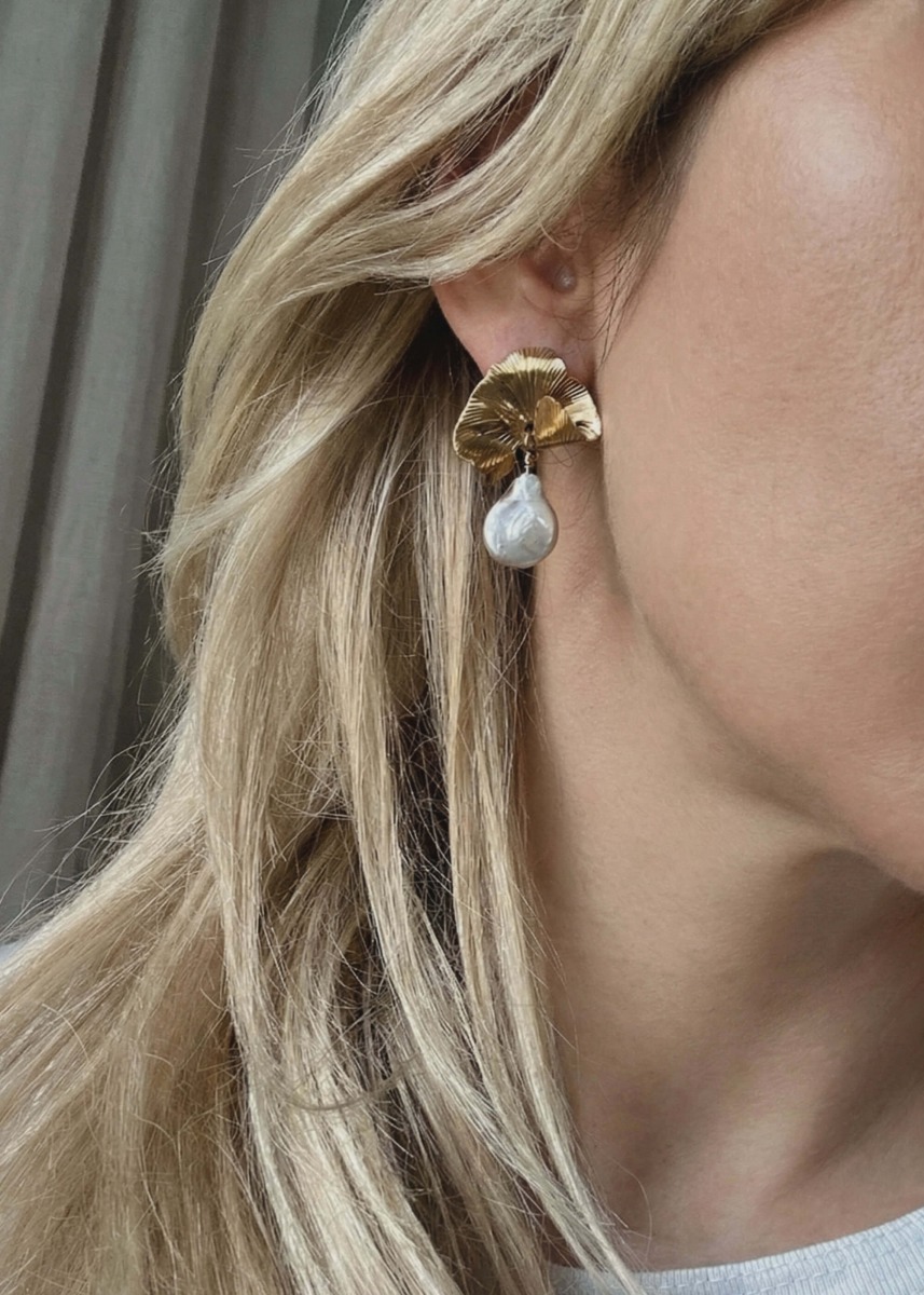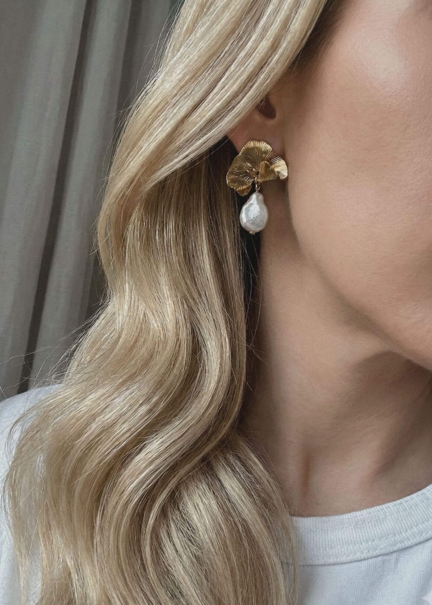 The Darcy earrings are a tribute to nature's imperfect beauty, encased in a sculptural, gilded form. Large, unique baroque pearls meet organically textured metal, creating a striking contrast between raw aesthetics and refined elegance. These statement pieces are designed for the modern woman, effortlessly transitioning from a casual day look to high-fashion evening attire.